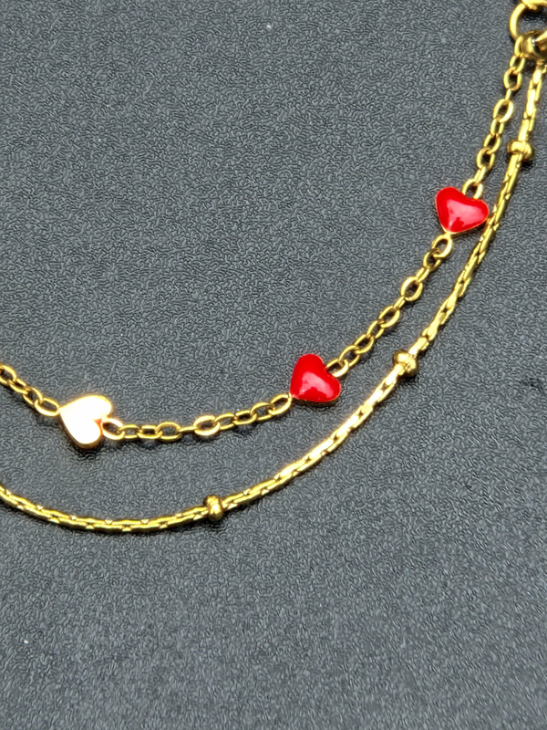 Dubbele armband met rode- en gouden hartjes. Materiaal stainlessteel, ook verkrijgbaar in stainlessteel zilver.