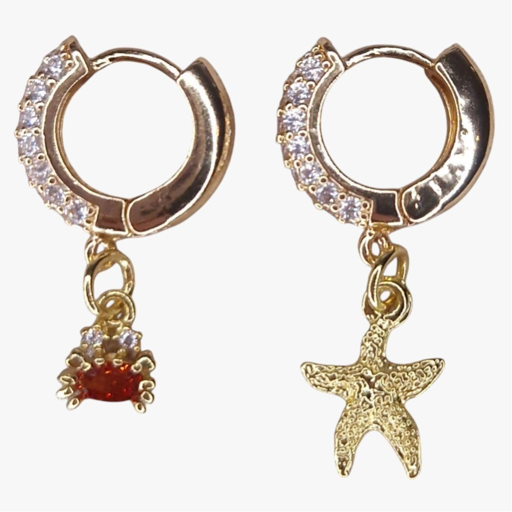 Prachtige oorringen met een krabje en een zeester. Materiaal ringen licht gouden plating. Bedel krabje 18K goldplated en zeester stainlessteel.