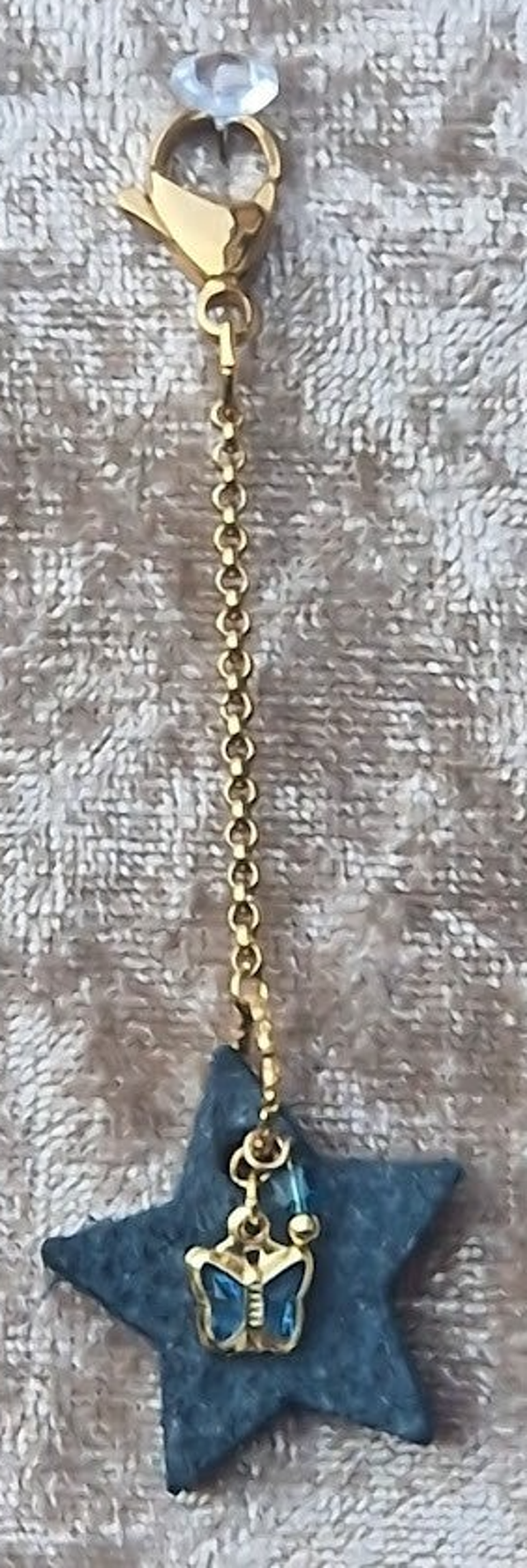 Sleutelhanger met klein blauw vlindertje en blauw kraaltje. Materiaal, stainlessteel en goldplated.