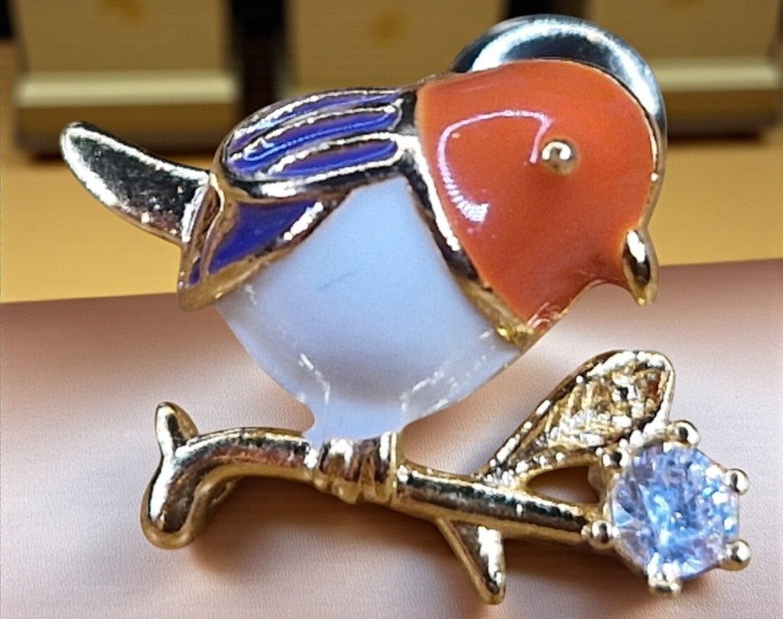 Super lief, klein vogeltje als pin, met een zirkonia diamantje. Super leuk op een jasje, trui, blouse of als eyecatcher op je tas.