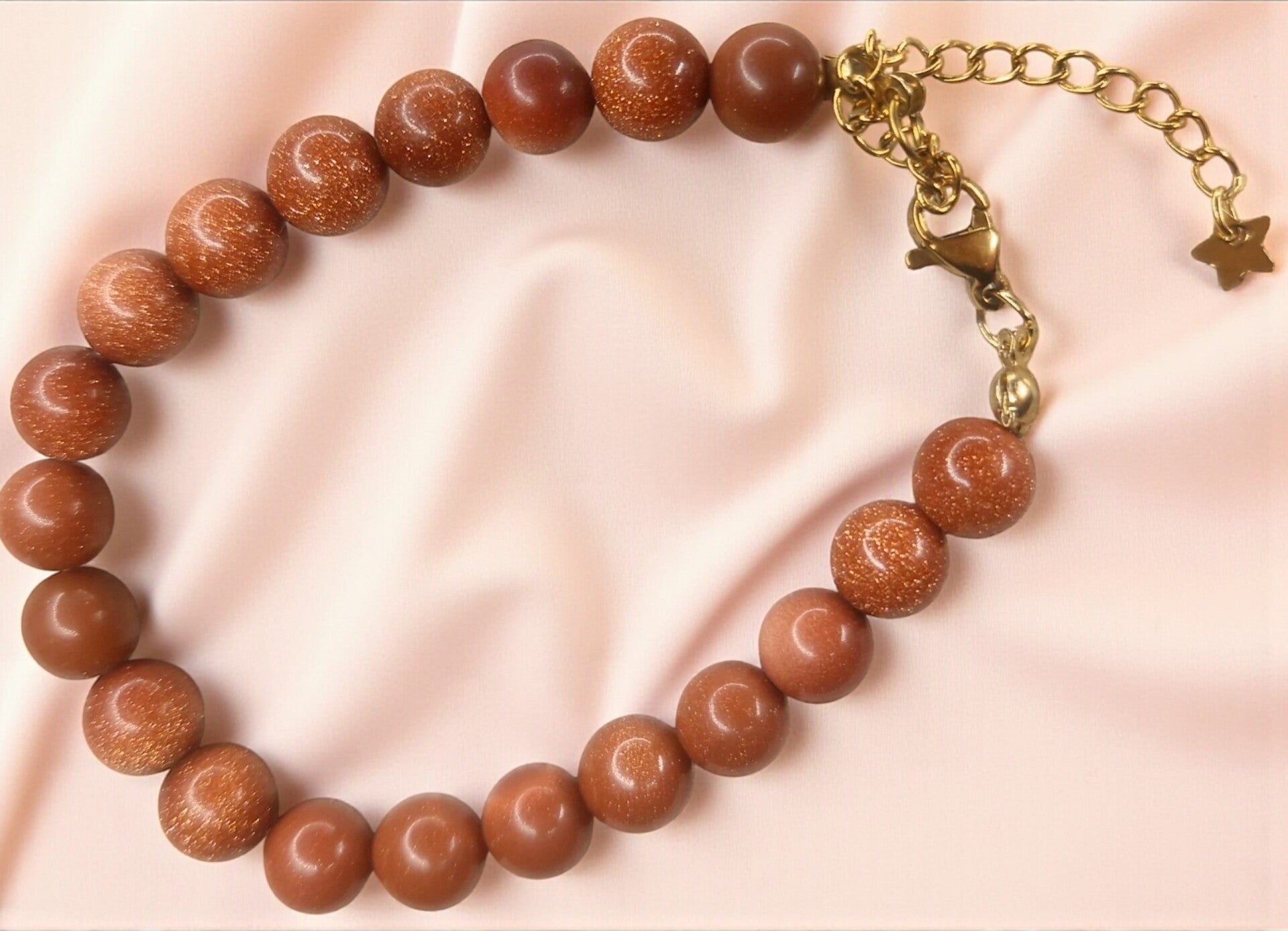 Armband gemaakt met goudsteen kralen, geregen op stevig draad en voorzien van kalot slotje en verlengkettinkje van stainlessteel.
