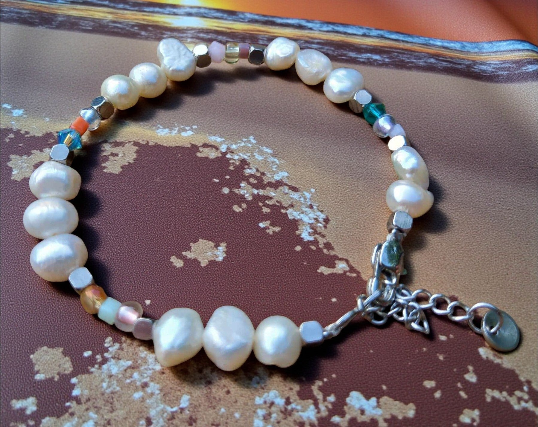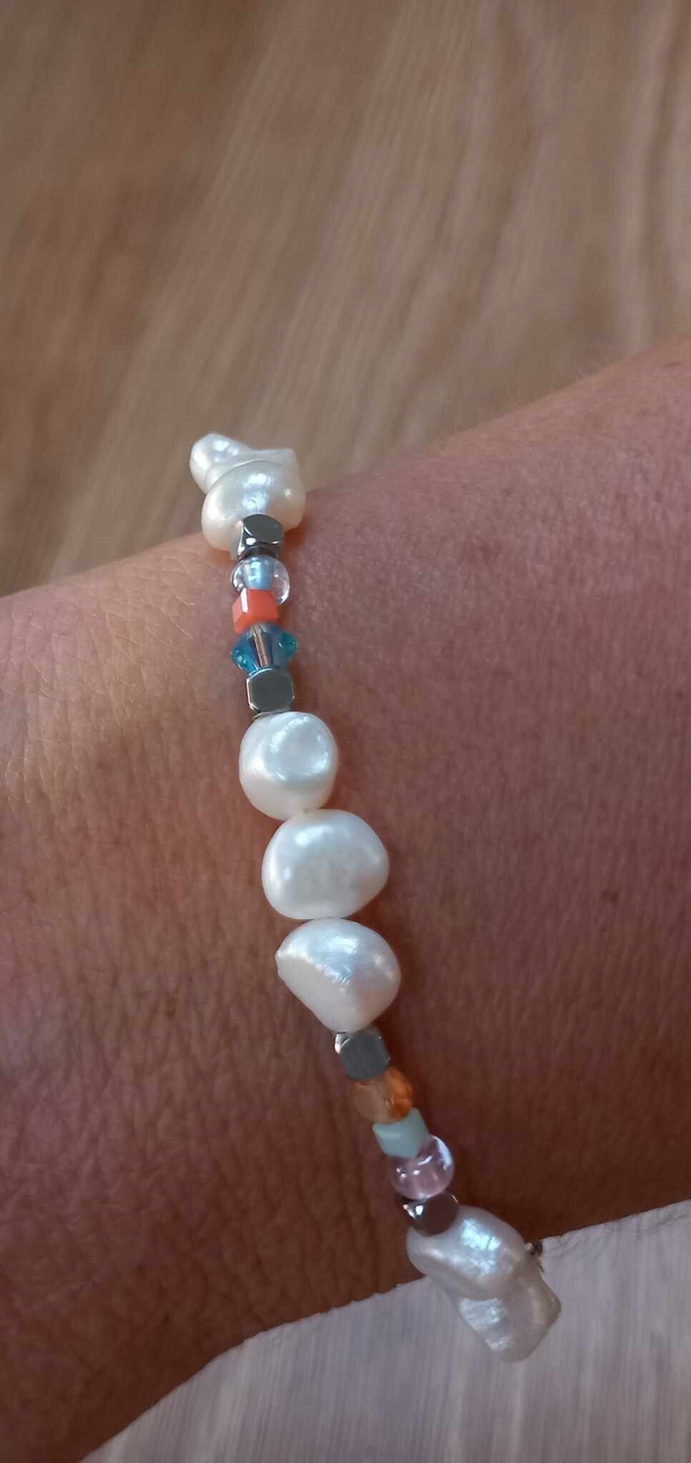 Armband "loua" is gemaakt van zoetwater parels en stainlessteel kralen en overige kraaltjes. Met verlengkettinkje en slotje stainlessteel zilver.