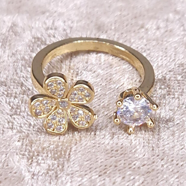 Prachtige ring met bloem en zirkonia kristal, materiaal 18K goldplated. Verstelbaar.