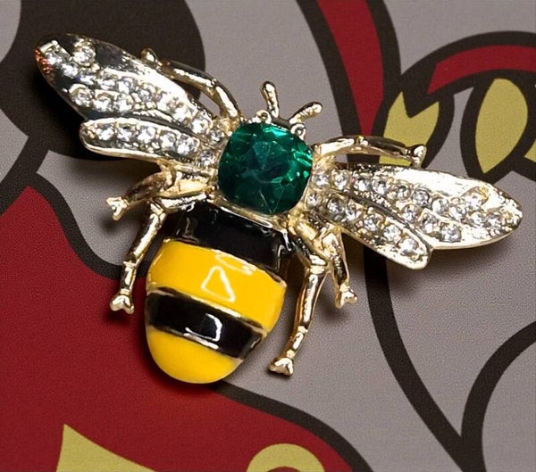Deze prachtige "BIJ" met grote groene steen is een ware eye cather voor op je tas en/of kleding en mag dus niet ontbreken als accesoires bij uw sieraden collectie.