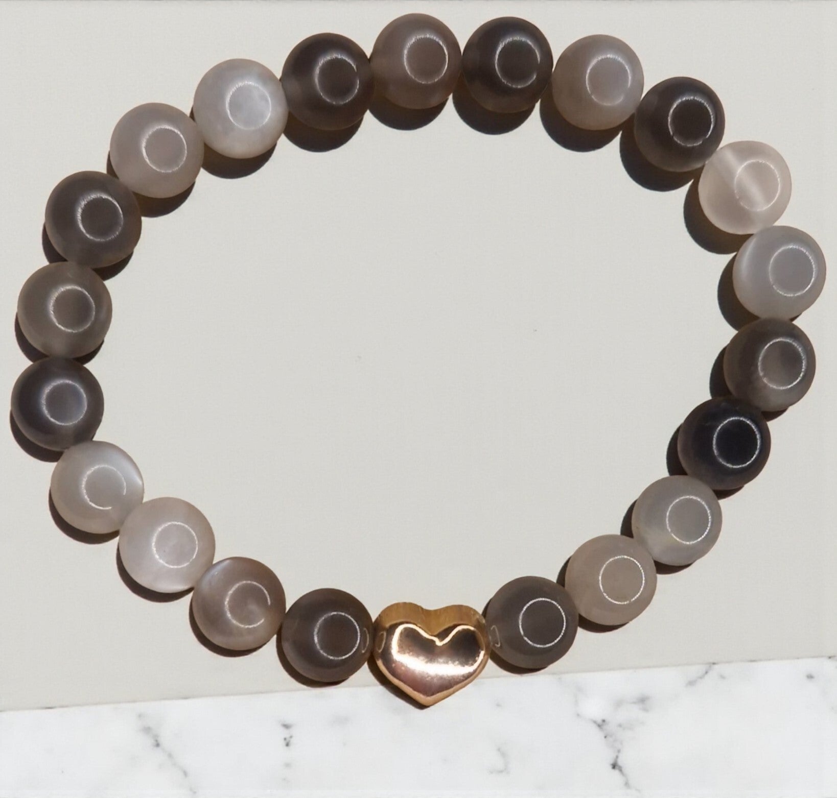 Natuursteen kralen armband van grijze maansteen kralen 8mm met gouden hart.