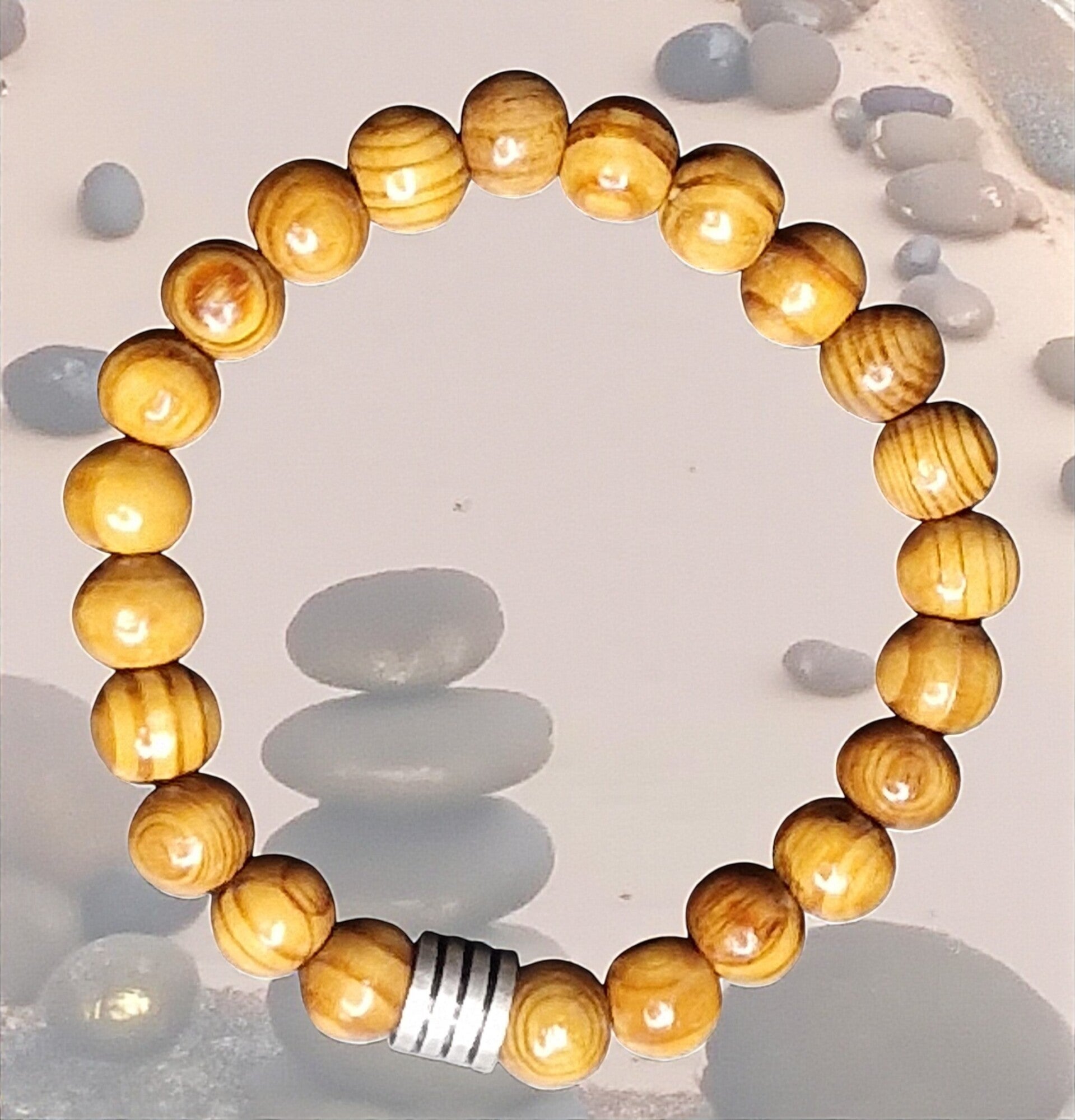 Armband gemaakt van blanken houten onbewerkte kralen waardoor je de ringen terugziet in de kraal en ze hun natuurlijke look behouden. Maat kraal 10cm.