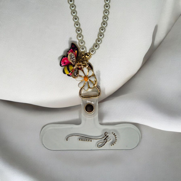 Telefoonketting met glasparels en lente bedels. Plaats het label met logo tussen je telefoon en het hoesje in. De kralensnoer haal je door de opening van het hoesje waar de oplader geplaatst wordt.