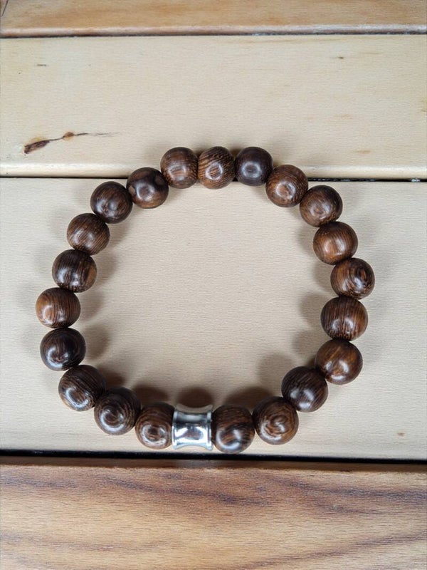 Armband met donker bruine houten kralen en stainlesssteel kraal. Super fijn en licht om te dragen. Mooie combinatie te maken met de anderen houten kralen armbanden en natuursteen kralen armbanden.