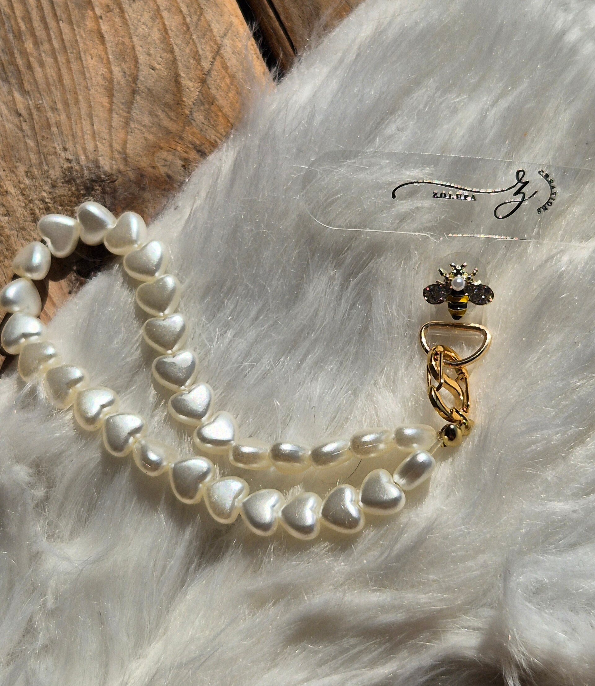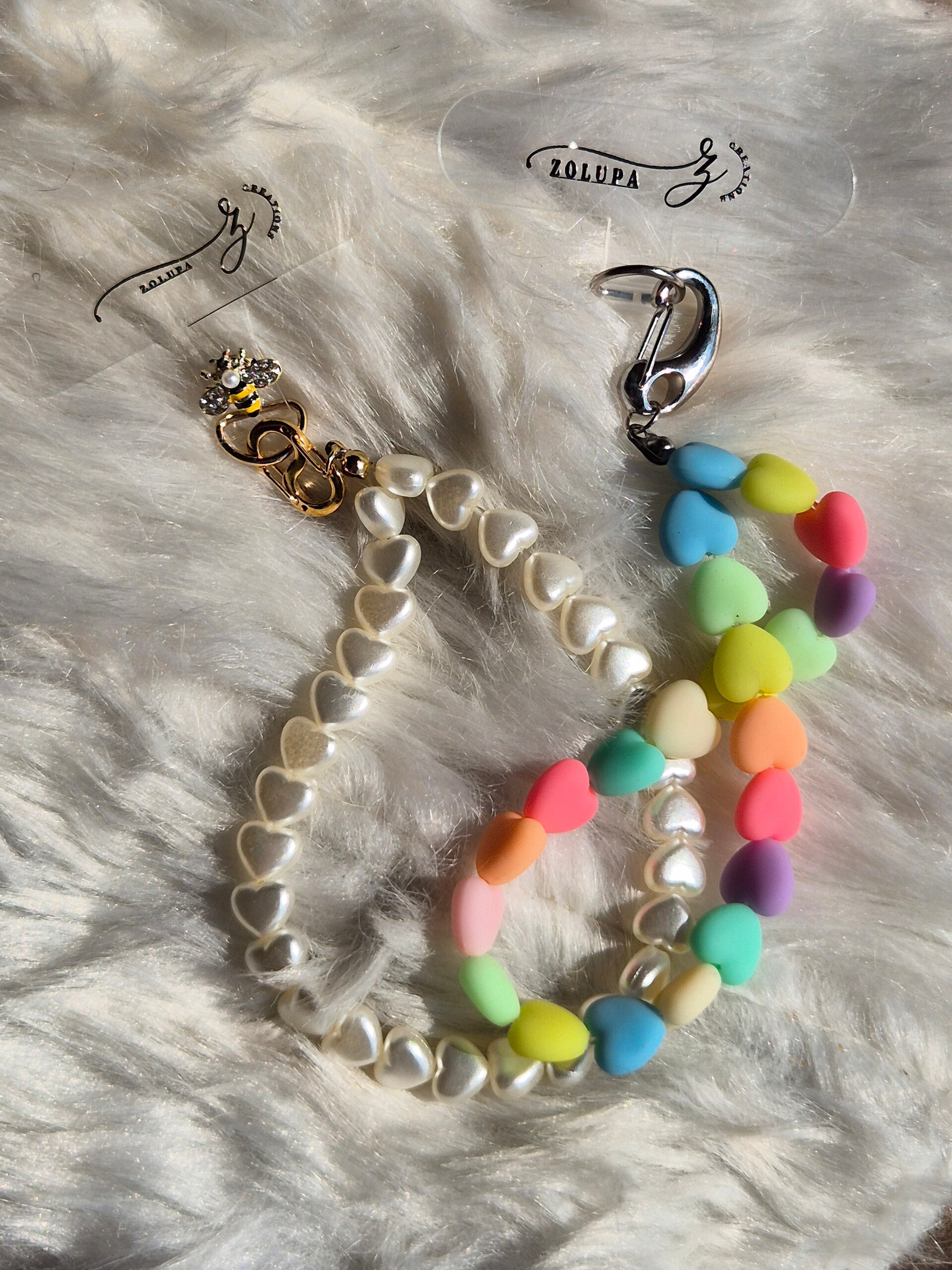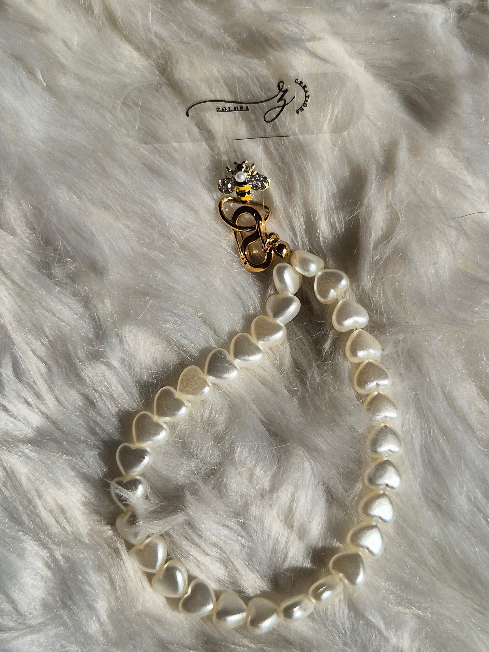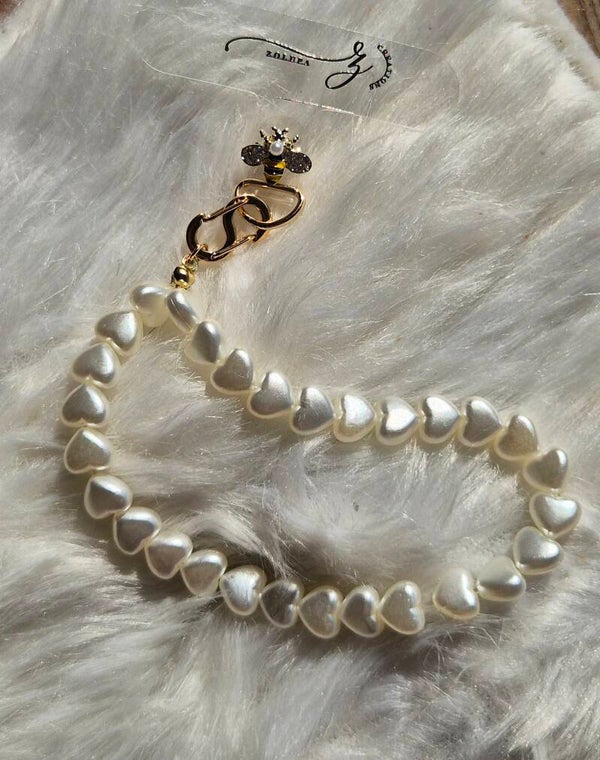 Telefoonkettinkje gemaakt met witte hartjes en schattig bijtje met zirkonia kristal.