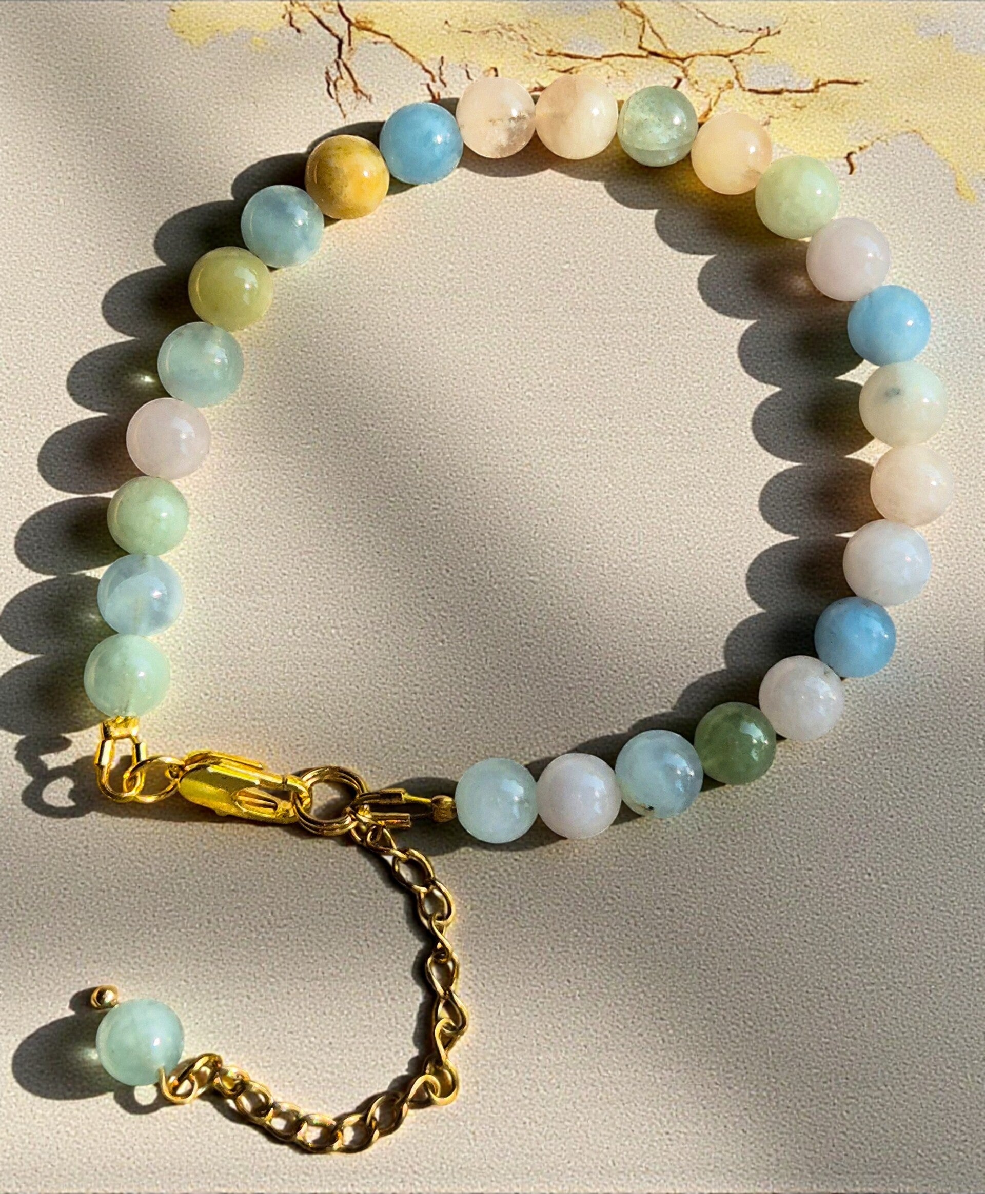 Natuursteen armband gemaakt met Morganiet kralen. Met veel outfits te combineren en zeker leuk om als persoonlijk cadeau te geven. Deze mooie kralen hebben naast gewoon mooi zijn ook een werking.