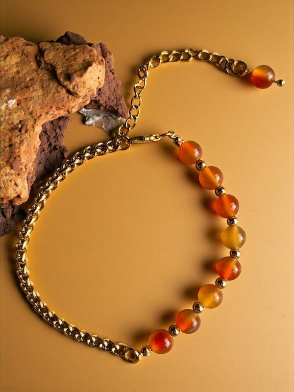 Armband Ize is gemaakt van halfedelsteen kralen "carneool" en stainlesssteel goudenjasseron.
