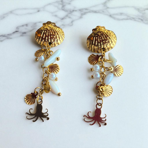 Vrolijke oorbellen met allerlei hangertjes uit de zee. Materiaal, stainlessteel gold.