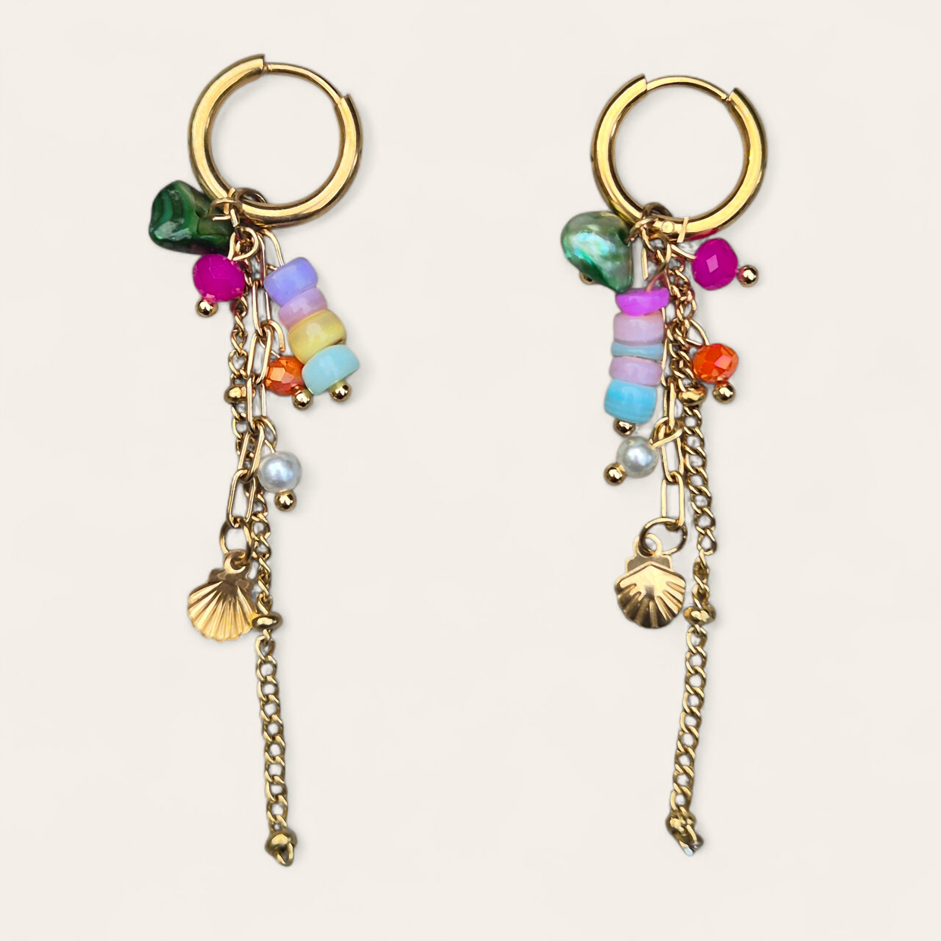 Vrolijke oorbellen met gekleurde steentjes en bedeltjes. Materiaal, stainlesssteel goud.