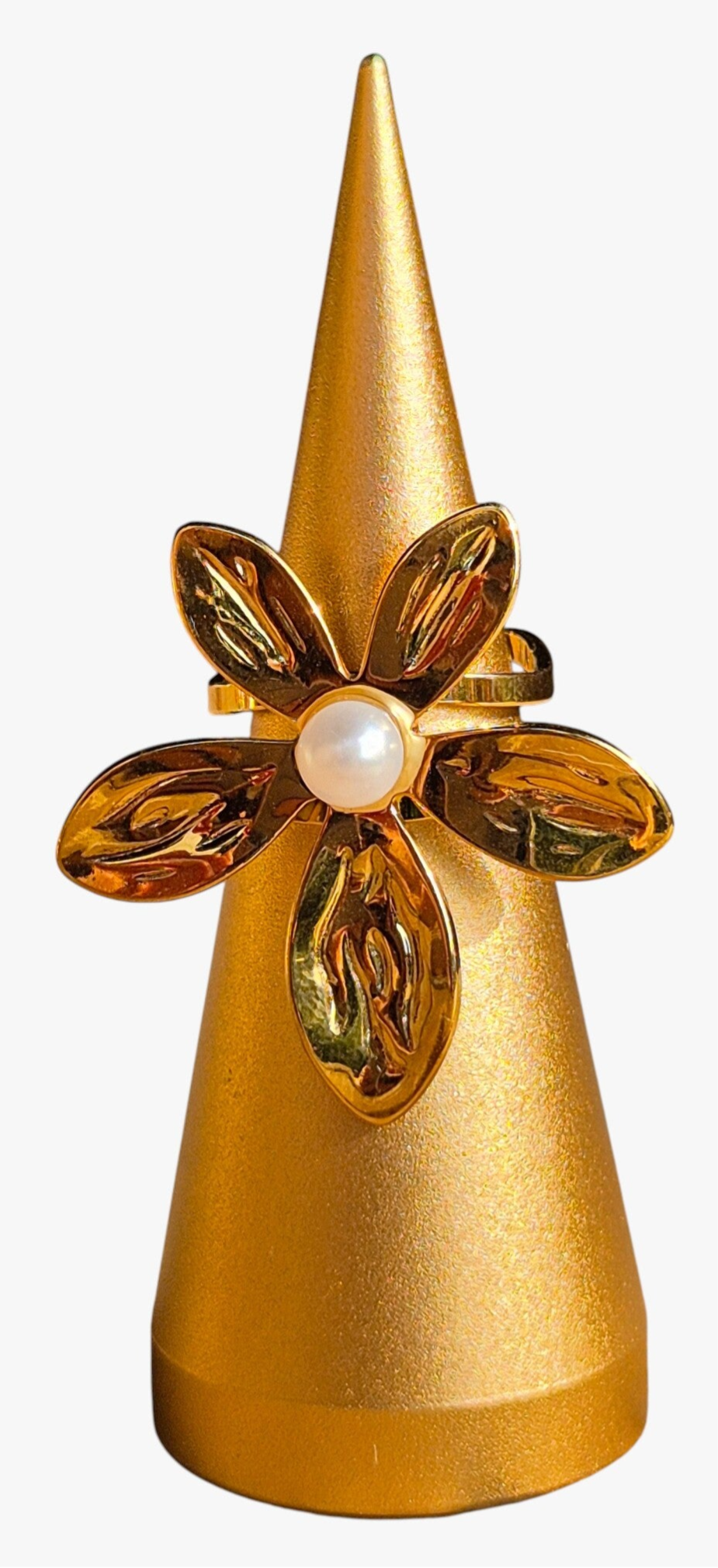 Ring Liya is een ring met een feestelijke, elegante uitstraling. Door grote bloem met in het hart een pareltje blijft deze zeker niet ongezien. Materiaal stainless steel goud.